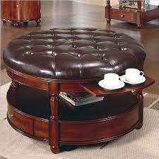 The classic espresso brown leather like upholstery makes this storage bench suitable as a coffee table ottoman in a living room or family room, or as extra seating in a study. It has a tufted design and fits perfectly in any corner of your home or office. To make use of the space under a window, find a long leather storage ottoman that will fit beneath the sill and fill it with books to create a cozy reading nook. Shop round leather ottoman coffee table from pottery barn. A large storage ottoman with a hidden compartment underneath the top lid, made out of faux leather in a black color padded around the solid wood structure and paired with an additional wooden top to make it stable.